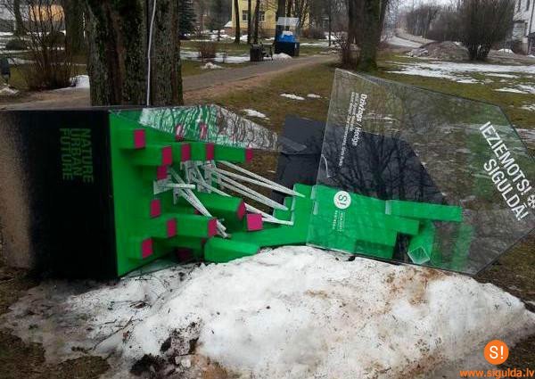 Naktī uz svētdienu Maija parkā izpostīti mākslinieces Agneses Melbārdes vides gaismas objekti - sajūtu aukstumnīcas “IEZIEMOTS!* SIGULDĀ!”.