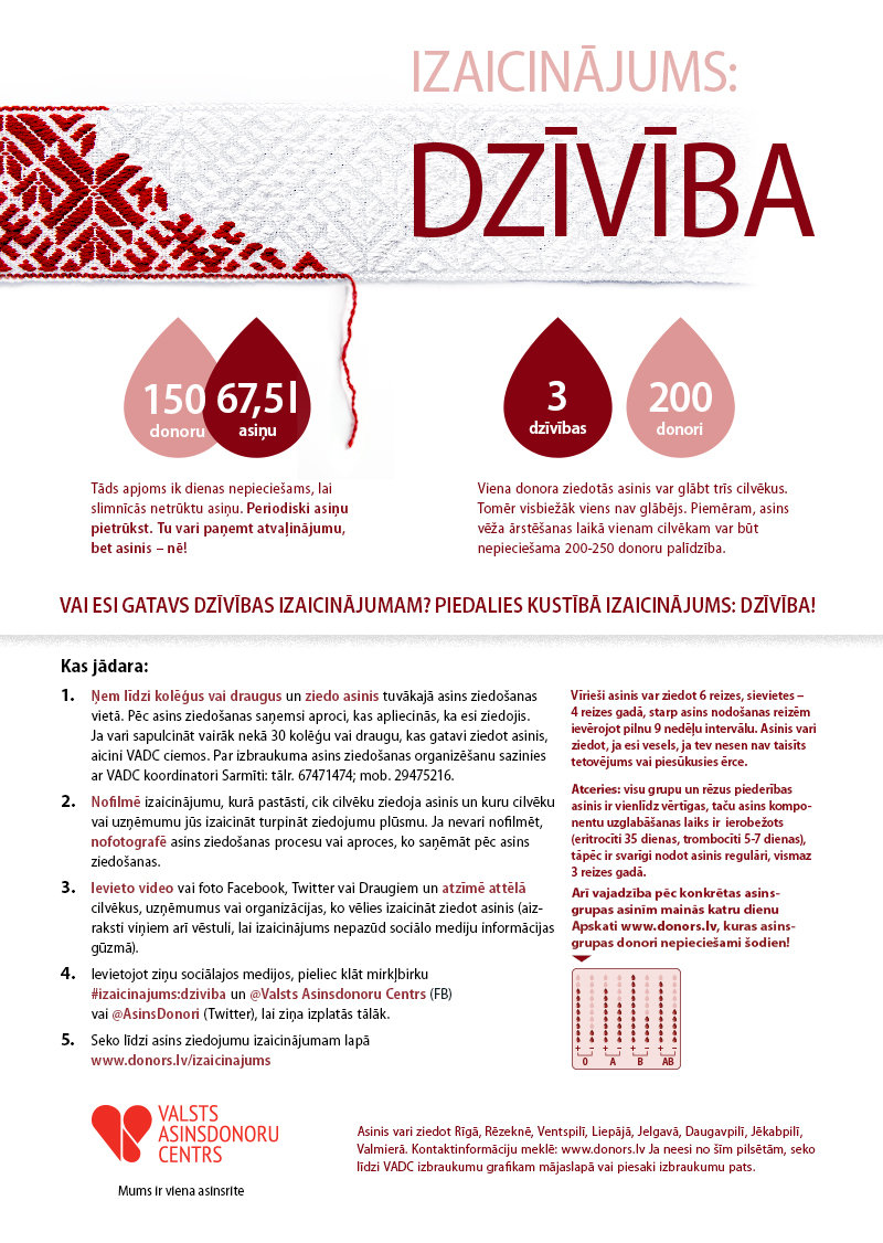Jūlijā un augustā papildus reklāmas kampaņai, Valsts asinsdonoru centrs izaicina uzņēmumus, pašvaldības, nevalstiskās organizācijas, valsts iestādes, sabiedrībā pazīstamus cilvēkus un ikvienu no mums ziedot asinis, publicēt vizuālu apliecinājumu sociālajos medijos un, izmantojot mirkļbirku #Izaicinajums:dziviba, mest tālāk izaicinājumu draugiem, paziņām, sadarbības partneriem, konkurentiem vai kaimiņam. Pirmajiem 4000 drosmīgajiem vasaras kampaņas ziedotājiem tiks dāvinātas arī īpašas aproces. Ar akcijas noteikumiem iespējams iepazīties šeit.