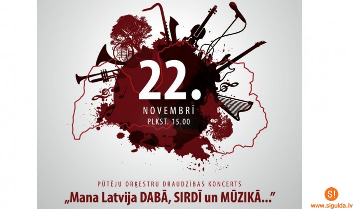Svētdien, 22. novembrī, plkst.15.00 Siguldas pagasta Kultūras namā, Zinātnes ielā 7B, notiks pūtēju orķestru draudzības koncerts „Mana Latvija DABĀ, SIRDĪ UN MŪZIKĀ...”. Piedalīsies pūtēju orķestri no Salaspils, Inčukalna, Siguldas un Līgatnes. Programmā latviešu un ārzemju komponistu mūzika.