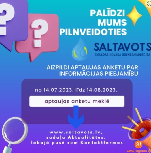 SIA "Saltavots" informē, ka sakarā ar maģistrālā ūdensvada aku aizbīdņu nomaiņu otrdien, 2. septembrī no plkst. 8.30 līdz 17.00 būs pārtraukta aukstā ūdens padeve abonentiem Cielavu, Bezdelīgu, Cīruļu, Smilgu, Vizbuļu, Gundegu, Kārklu ielās, Atbrīvotāju ielā no Nr. 21 un uz augšu, kā arī dzīvojamās mājas Kr. Barona ielā 12 iedzīvotājiem.