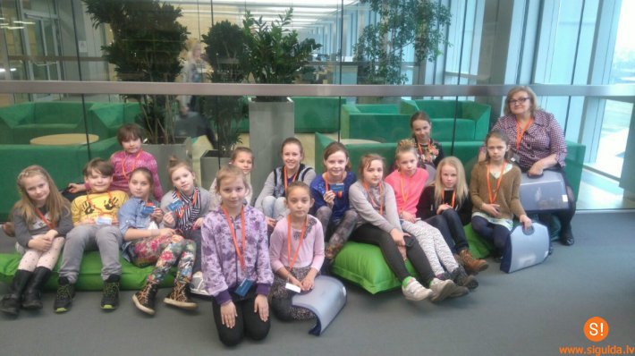 Apskate bibliotēkas varenajā celtnē tika sākta ar vestibila izpēti, kur grīdas flīzes veidotas latviskā drelļu rakstā. Ziedoņa zālē gide pastāstīja, ka sienas telpai un krēsli veidoti no Latvijas bērza, bet grīda – no Kanādas kļavas. Koku dabīgo aromātu varēja just arī telpā. Tālāk skolēni ciemojās bibliotēkas septiņos stāvos. Tajā dienā notika konference, tādēļ siguldiešiem nebija iespēja aplūkot Rīgas panorāmu no 11. un 12.stāva skatu laukumiem.