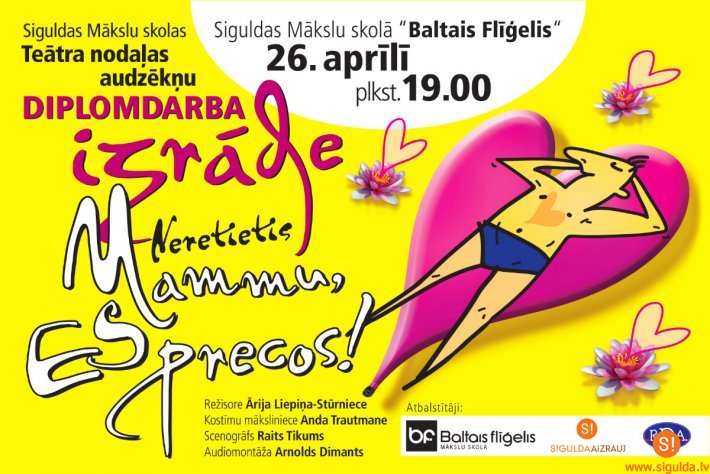 Otrdien, 26.aprīlī, plkst.19.00 Siguldas Mākslu skolā „Baltais Flīģelis” notiks Teātra nodaļas audzēkņu diplomdarba izrāde – Neretieša situāciju spēle „Mammu, es precos!”.
