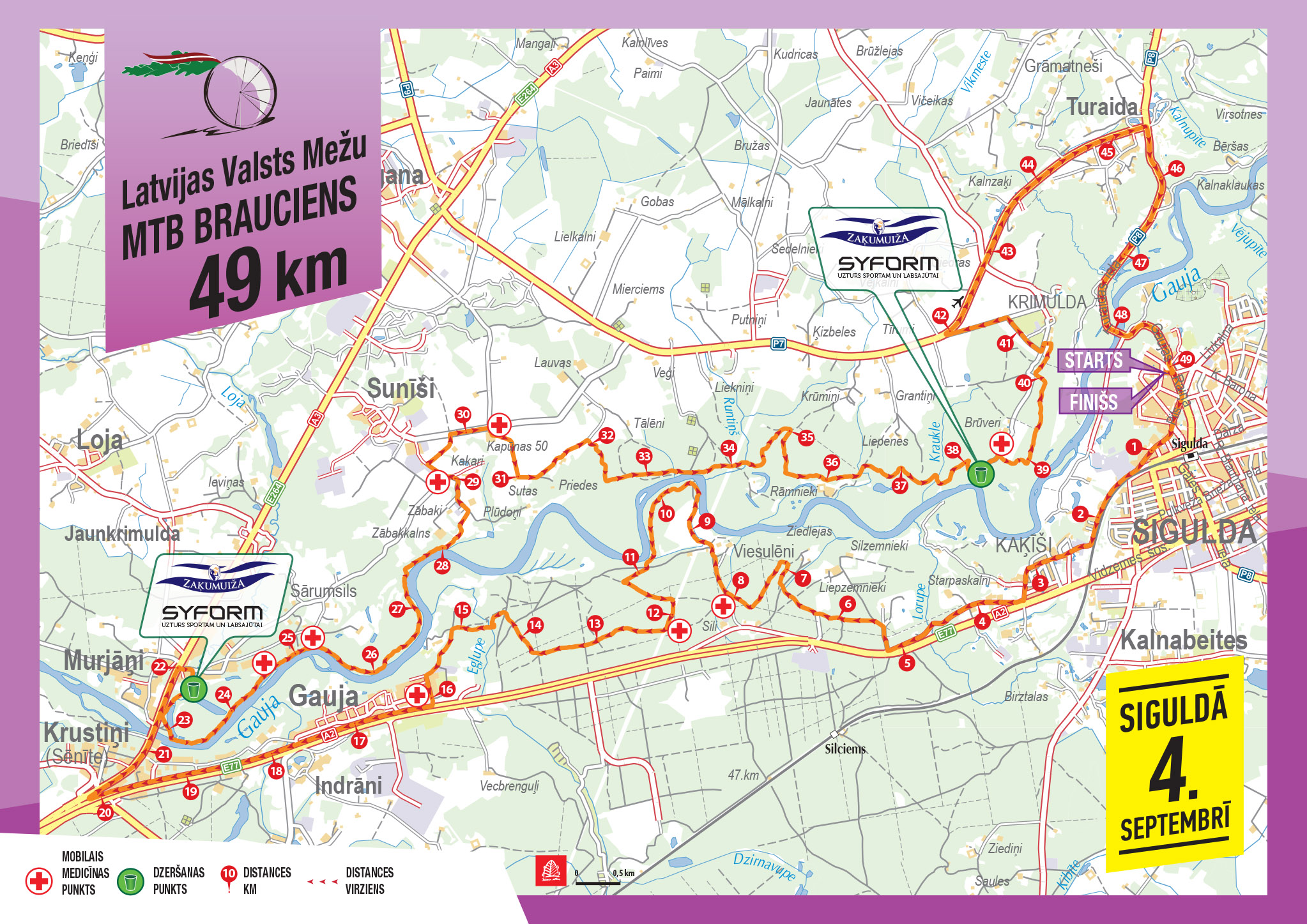 - MTB distance, starts plkst.13.00: Sigulda (Raiņa iela – Pils iela – Šveices iela – Kalna iela – Lorupes ceļš (V96)) – „Gauja” – „Sēnīte” (A2) – Murjāņi (A3) – Turaida – Sigulda ( P8). Satiksmes ierobežojumi maršrutā no plkst.12.40 līdz 17.00.