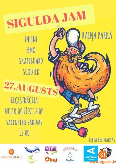 Sestdien, 27.augustā, plkst.12.00 Raiņa parkā norisināsies ekstrēmās skrituļslidošanas (inline) sacensības „Sigulda Jam”. Dalībnieku reģistrācija un iesildīšanās braucieni – no plkst.10.00.
