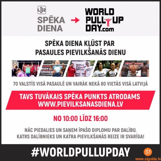 Sestdien, 10.septembrī, no plkst.10.00 līdz 16.00 labdarības pasākuma „Kalniešu spēles” laikā Siguldas Svētku laukumā norisināsies Pasaules pievilkšanās dienas (World Pull Up Day) aktivitātes – pievilkšanās pie stieņa, kas līdz šim plašāk bija pazīstama kā Vislatvijas Spēka diena.