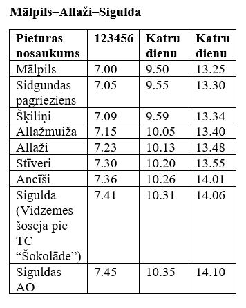 - Mālpils–Allaži–Sigulda (plkst.8.00 un plkst.16.10 no Mālpils);