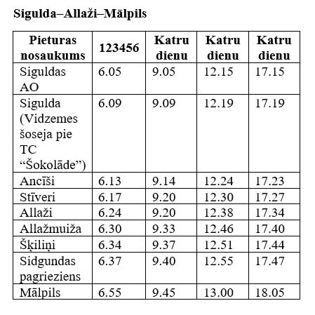 Maršruta reisi Mālpils–Allaži–Sigulda, kuros bez maksas var braukt skolēni, kursēs šādos laikos: