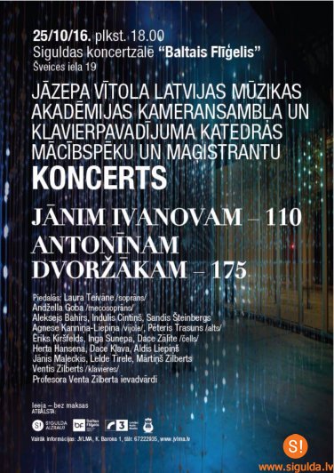 Otrdien, 25.oktobrī, plkst.18.00 Siguldas Mākslu skola „Baltais Flīģelis” ielūdz uz Jāzepa Vītola Latvijas Mūzikas akadēmijas Kameransambļa un klavierpavadījuma katedras mācībspēku un maģistrantu koncertu „Jānim Ivanovam – 110. Antonīnam Dvoržākam – 175.”