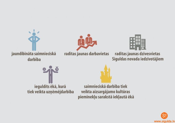 Noteikumi paredz, ka jaundibinātas saimnieciskās darbības veicēji turpmāk nekustamā īpašuma nodokļa atvieglojumu saņems divus gadus no reģistrācijas brīža: pirmajā gadā – 50 procentu apmērā, otrajā gadā – 25 procentu apmērā par ēku un tai piekritīgo zemi. Lai saņemtu atvieglojumu, jaunajiem uzņēmējiem jārada ne mazāk kā divas darba vietas, tajās jānodarbina Siguldas novadā deklarētās personas un darbinieku ikmēneša vidējā darba samaksa nedrīkst būt zemāka par valstī noteikto minimālo darba algu.