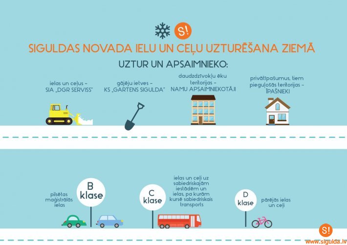 Pašvaldības pārraudzībā ir ceļi un ielas 285 kilometru garumā, kuru uzturēšanu veic publiskajā iepirkumā uzvarējušais SIA „DGR serviss”, savlaicīgi veicot ceļu attīrīšanu no sniega un apstrādājot brauktuvi ar pretapledojuma materiāliem. Gājēju ietves ziemā apsaimnieko KS „Gartens Sigulda”, daudzdzīvokļu dzīvojamo ēku teritorijas uztur namu apsaimniekotāji, savukārt privātīpašumus un tiem pieguļošās teritorijas – to īpašnieki.