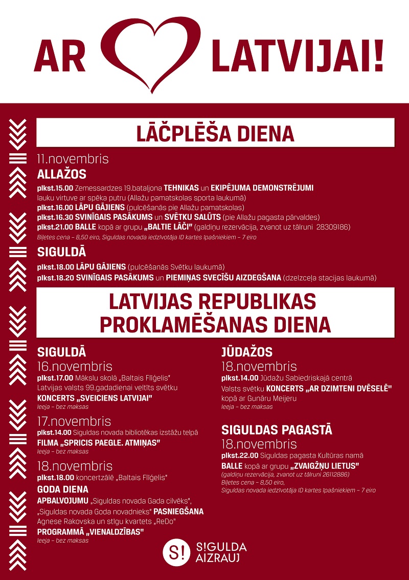 Siguldas novada pašvaldība valsts svētkus aicina atzīmēt, piespraužot pie apģērba lentīti Latvijas valsts karoga krāsās. Lentītes no 6. līdz 18.novembrim bez maksas varēs saņemt pašvaldības klientu apkalpošanas centros – Pakalpojumu centrā, Siguldas pagasta pārvaldē (2.stāvs), Mores pagasta pārvaldē un Allažu pagasta pārvaldē, kā arī Siguldas pagasta Kultūras namā un Jūdažu Sabiedriskajā centrā.