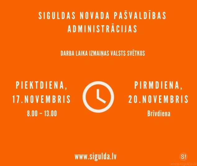 Latvijas Republikas valsts svētku laikā mainīts Siguldas novada pašvaldības administrāciju darba laiks. Piektdien, 17.novembrī darbadiena saīsināta par vienu stundu, savukārt pirmdien, 20.novembrī pašvaldības administrācija nestrādās.