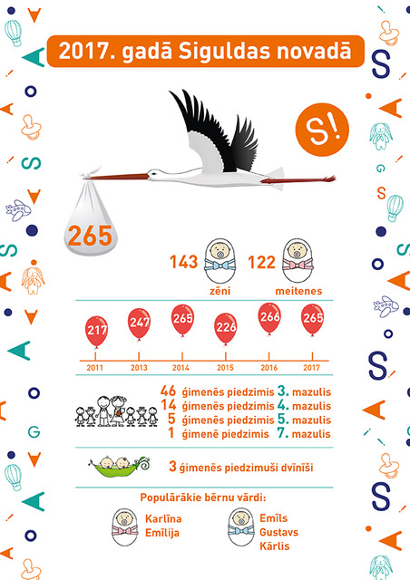 Siguldas novadā 2017.gadā reģistrēti 265 jaundzimušie – 143 zēni un 122 meitenes, kas ir tikai par vienu mazuli mazāk nekā 2016.gadā. 46 ģimenēs tie ir bijuši trešie bērniņi, savukārt 14 ģimenēs – ceturtie mazuļi. Piecās ģimenēs sagaidīts piektais mazulis, savukārt vienā – septītais. Trīs ģimenēs dzimuši dvīnīši. Siguldas novadā reģistrētas 388 daudzbērnu ģimenes.