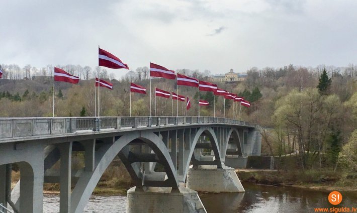 Gatavojoties Latvijas Republikas Neatkarības atjaunošanas gadadienai, ko visā Latvijā svinēs 4.maijā, kopš aprīļa beigām tiltu pār Gauju Siguldā atkal rotā 20 sarkanbaltsarkanie karogi.