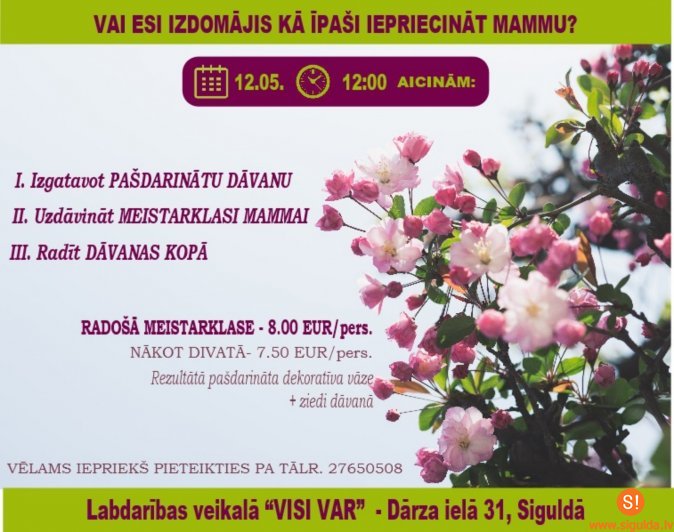 Labdarības veikals „Visi var” Dārza ielā 21, Siguldā, aicina uz radošo meistarklasi, lai izgatavotu īpašu dāvanu savai māmiņai. Meistarklase notiks 12.maijā plkst.12.00.