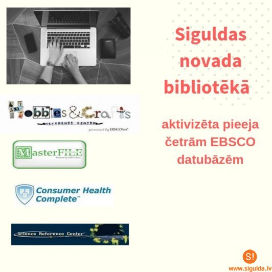 Sākot no 21.septembra Siguldas novada bibliotēka reģistrētiem lietotājiem bez maksas piedāvā četras EBSCO pilnteksa datubāzes – MasterFILE Premier, Consumer Health Complete, Science Reference Center un Hobbies & Crafts Reference Center –, izmantojot Siguldas novada bibliotēkas IP adresi vai arī attālināto piekļuvi no mājas datoriem un mobilajām ierīcēm, bibliotēkā saņemot piekļuvei izsniegtu kodu. Bezmaksas pieejas tiks nodrošinātas līdz 11. novembrim. Ja datubāzēm būs pieprasījums, tad tiks lemts par to abonēšanu turpmākajam periodam.