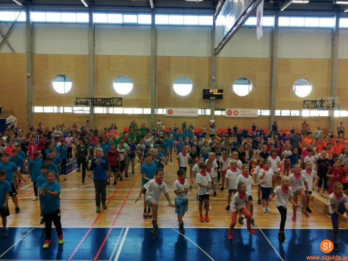 Siguldas Sporta centrā 3. un 4.klašu skolēni pēc vingrošanas kompleksa izpildīšanas devās uz dažādiem pieturpunktiem, lai izpildītu sporta uzdevumus gan individuāli, gan klašu komandās.