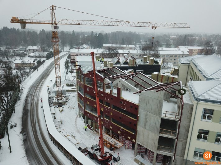 Ikdienā būvniecības darbos strādā turpat 60 darbinieku, kuri rūpējas, lai jaunbūvējamās ēkas arhitektoniskie un konstruktīvie risinājumi – dažādu materiālu pielietošana un savienojamība, alumīnija stiklotās konstrukcijas un dubultā stiklotā fasāde – tiktu kvalitatīvi samontēta. Būvuzņēmējs informē, ka janvāra vidū tiks demontēts celtnis, jo paredzēts pabeigt ēkas karkasa norobežojošo konstrukciju montāžas darbus.