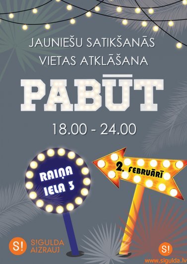 Sestdien, 2.februārī, plkst.18.00 Siguldas novada Jaunrades centrā, Raiņa ielā 3, notiks jauniešu satikšanās vietas atklāšanas pasākums „PABŪT”, kura mērķis ir iepazīstināt jauniešus ar jauniešu iniciatīvu centra „Mērķis” jauno nodarbību piedāvājumu, kas rosinās sevi pilnveidot, iegūt vai attīstīt savas prasmes un iemaņas, kā arī rakstīt pašiem savus projektus un īstenot iniciatīvas, vai vienkārši pabūt kopā ar saviem draugiem.