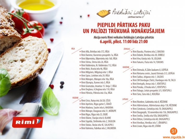 Sestdien, 6. aprīlī, no plkst. 11.00 līdz 21.00 lielākajos „Rimi” veikalos, tajā skaitā veikalā „Rimi Sigulda” tirdzniecības centrā „Šokolāde” Strēlnieku ielā 2 norisināsies labdarības akcija „Paēdušai Latvijai”. Tās laikā ikviens aicināts papildus saviem ikdienas pirkumiem iegādāties produktus un piepildīt pārtikas paku, lai palīdzētu trūkumā nonākušajiem – ģimenēm ar bērniem, senioriem un personām ar invaliditāti.
