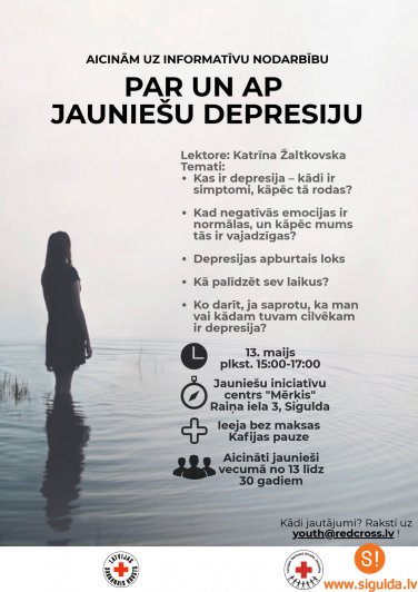 Pirmdien, 13. maijā, no plkst. 15.00 līdz 17.00 jauniešu iniciatīvu centrā „Mērķis”, Raiņa ielā 3, notiks praktisks seminārs „Par un ap jauniešu depresiju” kopā ar Latvijas Sarkanā Krusta lektori, psiholoģi Katrīnu Žaltkovsku.
