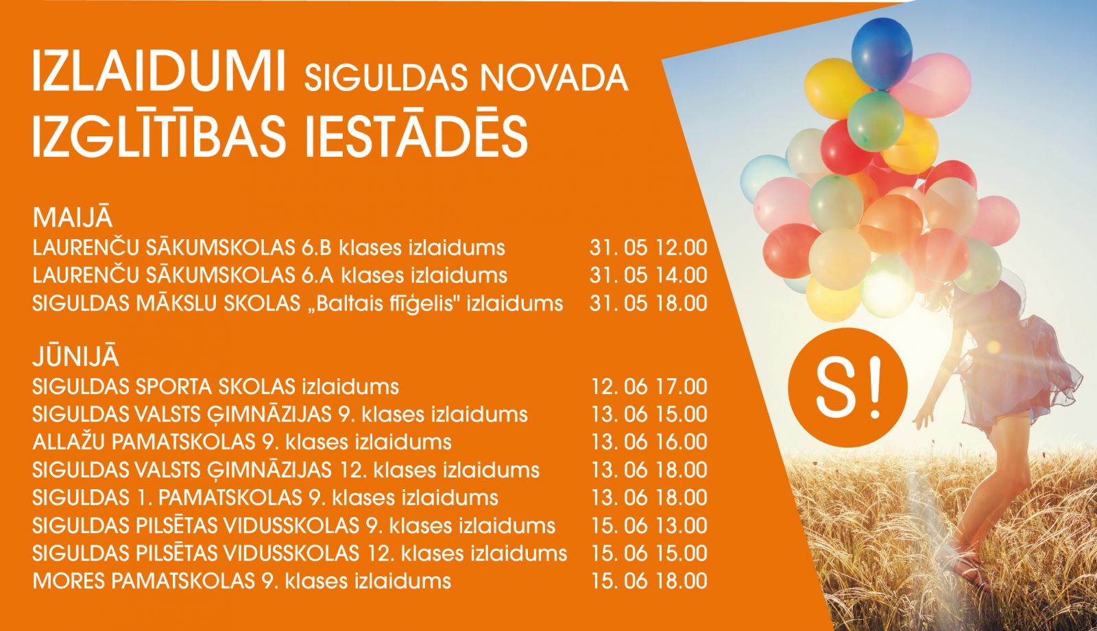 Tuvojas mācību gada noslēgums un drīzumā sāksies skaistie izlaiduma mirkļi 9. un 12. klašu skolēniem, viņu vecākiem un pedagogiem. Izlaidumi notiks arī Laurenču sākumskolas 6. klases skolēniem, Siguldas Sporta skolas un Mākslu skolas audzēkņiem.