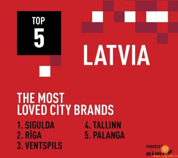 Šogad Latvijas mīlētākās pilsētas zīmolu topā ar vienādu rezultātu (32,2% katram) pirmo vietu dalīja Sigulda un Rīga. Zīmolu tops tiek veidots jau kopš 2004. gada. Un pēdējos gados Sigulda bija novērtēta atzinīgi, esot zīmolu topa līderu vidū, bet pērn pirmoreiz tika atzīta par mīlētāko pilsētu Latvijā.