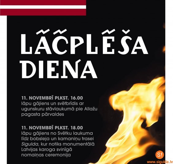 Savukārt plkst. 17.30 novada iedzīvotāji, uzvelkot rakstainus cimdus, aicināti pulcēties Svētku laukumā, lai plkst. 18.00 dotos vienotā lāpu gājienā uz bobsleja un kamaniņu trasi “Sigulda”. Pie tās plkst. 18.30 notiks monumentālā Latvijas karoga svinīgā nomaiņas ceremonija, kā arī varēs vērot īpašu māksliniecisko veltījumu Lāčplēša dienai. Novadnieki aicināti līdzi ņemt lāpas un svecītes, kuras būs iespēja izvietot gaismas sienā bobsleja un kamaniņu trases mūrī.