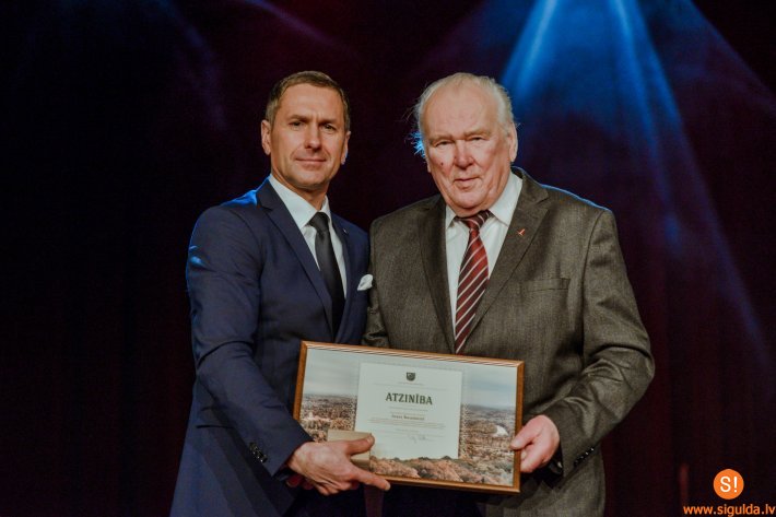 Siguldas novada pašvaldības augstākos apbalvojumus pasniedza Siguldas novada pašvaldības domes priekšsēdētājs Uģis Mitrevics un vietniece Līga Sausiņa, pasniedzot pašvaldības Atzinību, sudraba Siguldas novada ģerboņa piespraudi, kā arī lina šalli, kuru īpaši šim pasākumam darinājušas SIA “Varnna” audējas Siguldas pils kvartālā.