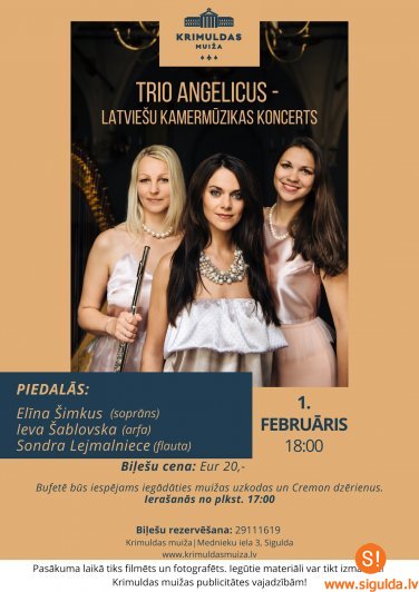 Sestdien, 1. februārī, plkst. 18.00 Krimuldas muižā uz kamermūzikas koncertu aicina “Trio Angelicus”. Soprāns Elīna Šimkus, arfiste Ieva Šablovska un flautiste Sondra Lejmalniece koncertā atskaņos vairāku iemīļotu latviešu komponistu – Artūra Maskata, Selgas Mences, Vestarda Šimkus, Jura Karlsona, Ērika Ešenvalda, Jāņa Lūsēna, Raimonda Paula, Jāzepa Mediņa, Jāņa Mediņa, Emīla Dārziņa – skaņdarbus.