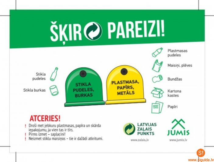 Lai arī iedzīvotāju aktivitāte atkritumu šķirošanā arvien pieaug, tomēr SIA “JUMIS” jaunākie dati liecina, ka šķirošanas konteineros nonāk līdz pat 30% nešķiroto sadzīves atkritumu, kuri tādējādi bojā šķiroto materiālu kvalitāti un pārstrādes iespējas. Uzņēmums atgādina, ka plastmasas, papīra un metāla iepakojumam paredzētajās šķirošanas tvertnēs atļauts izmest PET pudeles, šampūnu, mazgāšanās līdzekļu, sadzīves tīrīšanas līdzekļu pudeles, plastikāta maisus, tetrapakas, preču kartona kastītes (nelaminētas), skārdenes un cita veida iepakojumu, kā arī sausu un tīru makulatūru. Stikla konteinerā ievietojamas tikai dažādu krāsu un formu dzērienu stikla pudeles un burkas. Cita veida atkritumus, piemēram, nolietoto elektroniku, smēreļļas un automašīnas riepas var nodot atkritumu šķirošanas laukumā “Zemdegas”, Siguldas pagastā.