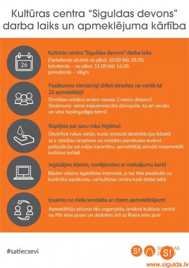 Ņemot vērā valdības pieņemtos lēmumus par kultūras norišu vietām, pakāpeniski tiks atsākta kultūras centra “Siguldas devons” darbība. No 26. maija “Siguldas devons” apmeklētājiem būs atvērts no otrdienas līdz piektdienai no plkst. 10.00 līdz 18.00, sestdienās un svētdienās no plkst. 11.00 līdz 16.00, bet pirmdienās būs slēgts.