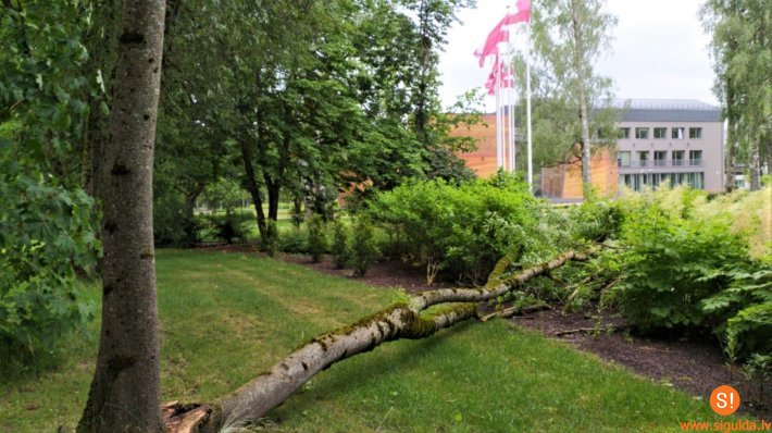 Stiprā vēja laikā pie kultūras centra “Siguldas devons” nolūzis osis; atbildīgie speciālisti tuvākajā laikā koku novāks.