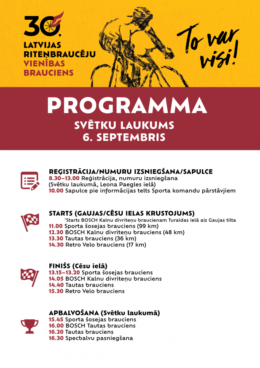 Atzīmējot 30 gadu jubileju, 6. septembrī Siguldā norisināsies 30. Latvijas riteņbraucēju Vienības velobrauciens. Sacensību starts un finišs tiks dots Cēsu ielā pie Spieķu laukuma, bet Bosch MTB distances starts notiks Turaidas ielā aiz Gaujas tilta.