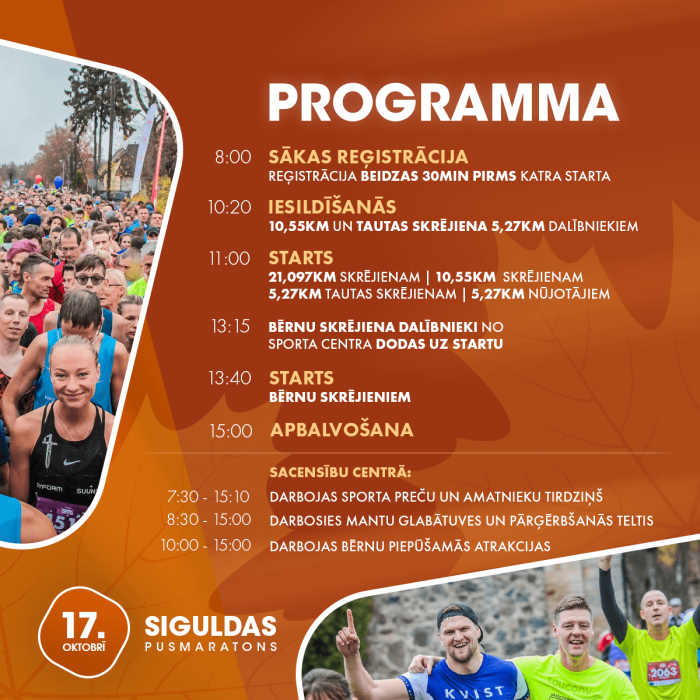 Sestdien, 17. oktobrī, plkst. 11.00 pie Siguldas sporta centra tiks dots starts 10. Siguldas pusmaratonam, aicinot novadniekus un sportistus no visas Latvijas pavadīt laiku aktīvi un baudīt krāšņo Siguldas un Gaujas senielejas dabu rudens pilnbriedā.