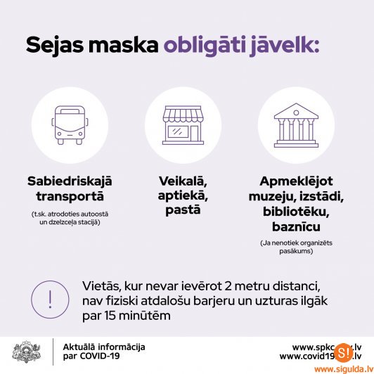 Ņemot vērā straujo Covid-19 izplatības pieaugumu Latvijā, Ministru kabinets 13. oktobra sēdē pieņēma lēmumu, ka turpmāk sejas maskas būs jāvelk bibliotēkās, apmeklējot izstādes, bet nebūs jāvelk, atrodoties kultūras pasākumos – fiksētās, personalizētās sēdvietās. Kultūras centrs “Siguldas devons” aicina iedzīvotājus, apmeklējot kultūras centru un dodoties uz izstādi, lietot mutes un deguna aizsegu. Savukārt, apmeklējot pasākumu, kurā ir personalizētas sēdvietas, sejas masku var neizmantot, taču apmeklētāji aicināti lieki nedrūzmēties un doties uz savu sēdvietu, drošības nolūkos sejas maskas jāizmanto arī pirms un pēc pasākuma, kā arī pasākuma starpbrīdī.