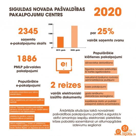 2020. gadā Siguldas novada pašvaldībā būtiski palielinājies saņemto neklātienes pakalpojumu skaits. Līdzīgi kā iepriekšējos gados, arī 2020. gadā saņemto e-pakalpojumu pieteikumu skaits ir strauji audzis – pērn saņemti 2345 e-pakalpojumu pieteikumi, kas ir divas reizes vairāk nekā 2019. gadā. Tāpat, turpinot darbu pie pašvaldības izvirzītajām videi draudzīgajām iniciatīvām, lai pašvaldības darbā un novada teritorijā ieviestu ilgtspējīgas saimniekošanas metodes, pērn gandrīz divas reizes palielinājies arī pašvaldības elektroniski izsūtīto dokumentu skaits. Siguldas novada pašvaldības Pakalpojumu centrā par 25% palielinājies arī saņemto zvanu skaits, kā arī sniegtas atbildes uz iedzīvotāju uzdotajiem jautājumiem pašvaldības oficiālajā e-pastā pasts@sigulda.lv un pašvaldības tīmekļa vietnes www.sigulda.lv pakalpojumā “Vēstule pašvaldībai”. Savukārt Pakalpojumu centrā klātienē apkalpoto klientu skaits ir samazinājies, kas ir tikai likumsakarīgi, ņemot vērā valstī noteiktos drošības pasākumus Covid-19 izplatības ierobežošanā un klātienes klientu apkalpošanas ierobežojumus.