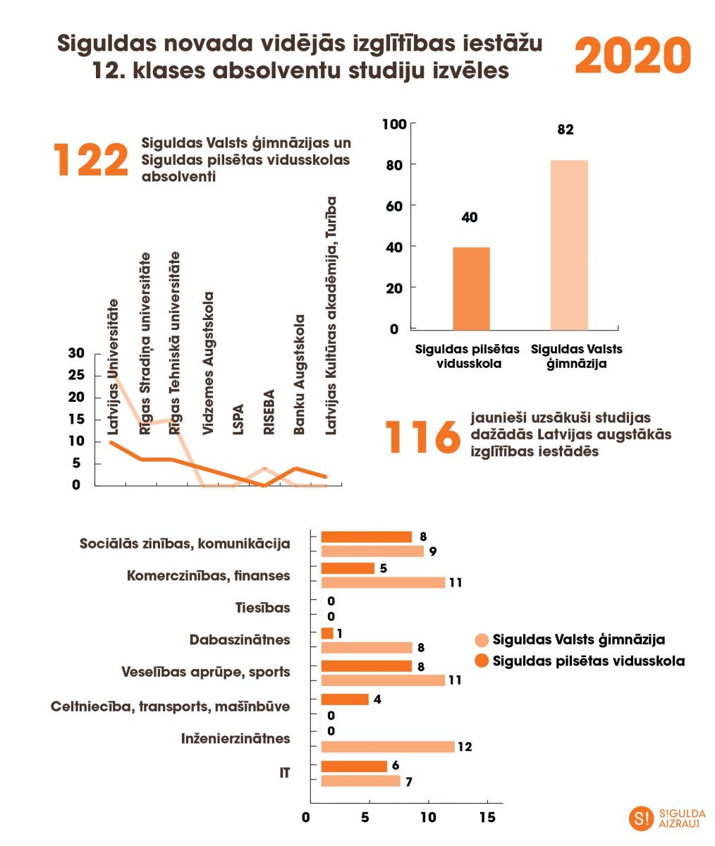 2019./2020. mācību gadā Siguldas Valsts ģimnāziju un Siguldas pilsētas vidusskolu absolvēja 122 audzēkņi, no kuriem 116 jaunieši uzsākuši studijas dažādās Latvijas augstākās izglītības iestādēs, bet viens Siguldas Valsts ģimnāzijas absolvents studijas turpina universitātē Lielbritānijā. Absolventi visvairāk izvēlējušies studēt sociālās zinības, komunikāciju, komerczinības, veselības aprūpi un dabaszinātnes (IT, matemātika). Salīdzinoši – 2018. un 2019. gada absolventi visvairāk bija izvēlējušies studēt inženierzinātnes, kas piedāvā labas karjeras iespējas gan Latvijā, gan ārzemēs.
