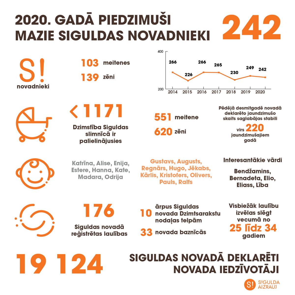 Pagājušajā gadā Siguldas novadā deklarēti 242 jaundzimušie – 139 zēni un 103 meitenes, no kuriem trīs dvīņu pāri. Pērn Siguldas novada Dzimtsarakstu nodaļā reģistrēti 156 miršanas gadījumi. Uz 2021. gada 1. janvāri Siguldas novadā deklarēti 19 124 novada iedzīvotāji, kas ir par 87 iedzīvotājiem vairāk nekā 2020. gada 1. janvārī (19037), kas kopumā norāda ne tikai uz to, ka Siguldas novadā novērojams dabiskais pieaugums, bet arī notiek dzīvojamā fonda paplašināšanās, kas dod iespēju uz Siguldas novadu migrēt citu pašvaldību iedzīvotājiem.