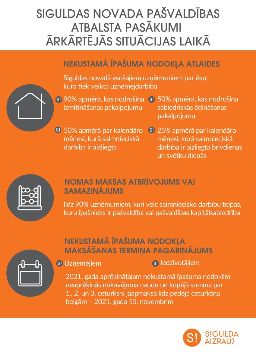 - lai palīdzētu viesmīlības sektora uzņēmējiem, piemērota nekustamā īpašuma nodokļa atlaide par ēku, kurā tiek veikta uzņēmējdarbība, 90% apmērā Siguldas novadā esošajiem uzņēmumiem, kas nodrošina izmitināšanas pakalpojumu, kā arī 50% apmērā – sabiedriskās ēdināšanas uzņēmumiem 2021. gadā;