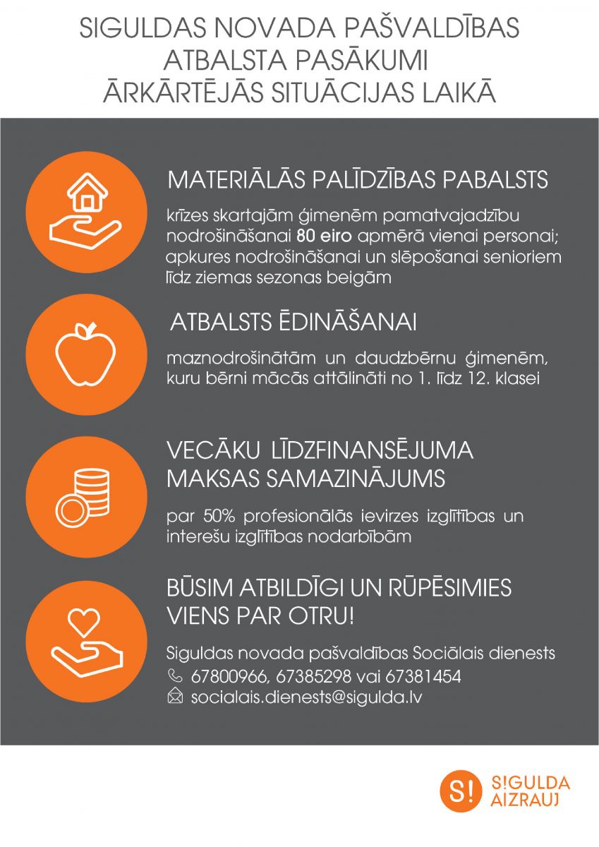 Siguldas novada pašvaldības Sociālais dienests atgādina, ka novadniekiem nepieciešamības gadījumā ir iespēja saņemt dažādus sociālos pakalpojumus. Novadnieki, kuriem nepieciešams atbalsts, var vērsties Sociālajā dienestā, kur katrs gadījums tiek izskatīts individuāli, un pēc nepieciešamības tiks nodrošināts vajadzīgais pakalpojums – bezmaksas psihologa konsultācijas, sociālā darbinieka konsultācijas, Eiropas Sociālā fonda pārtikas pakas, higiēnas preču pakas trūcīgām un maznodrošinātām ģimenēm vai “Paēdušai Latvijai” pārtikas pakas.