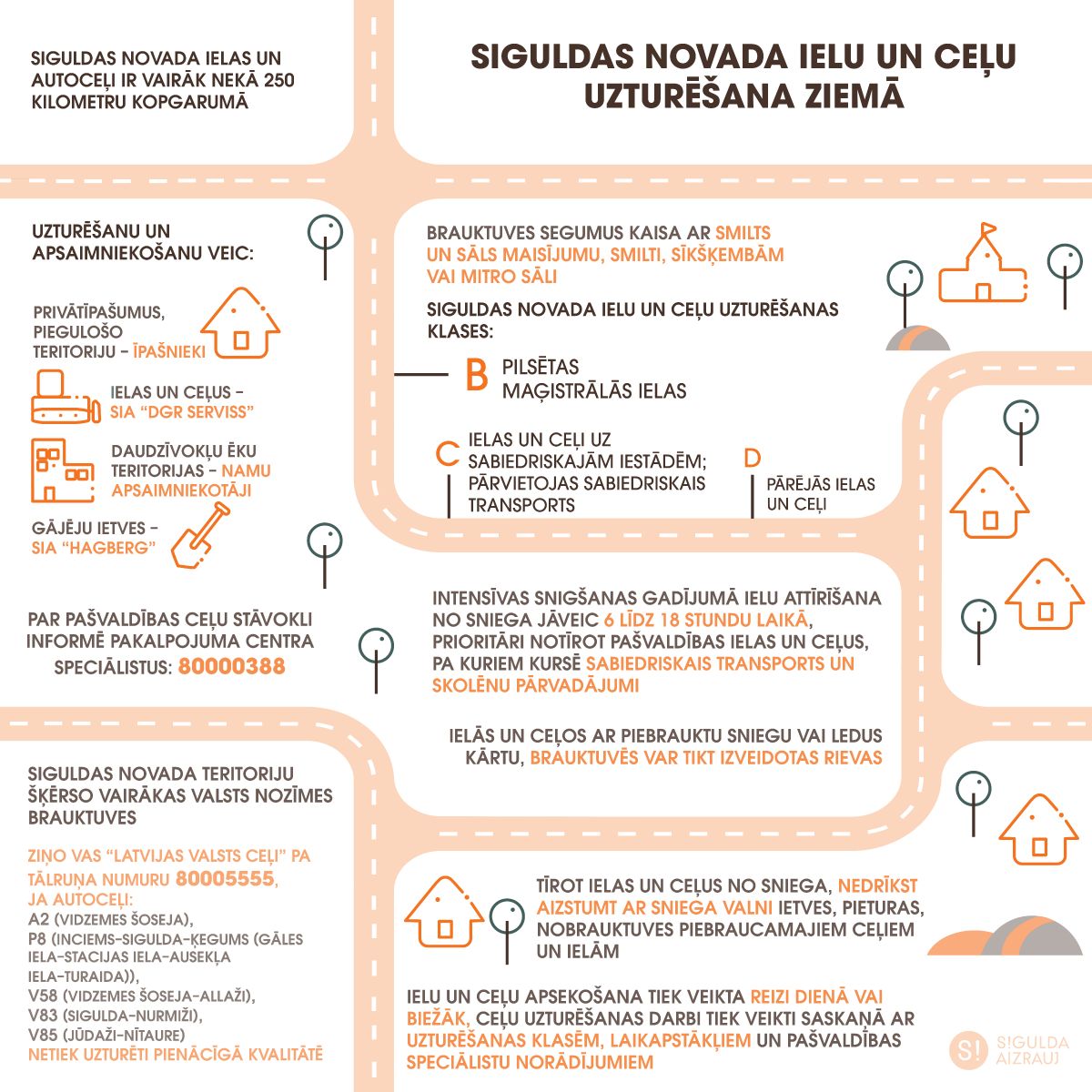 Ielu un ceļu apsaimniekošanas dienesti aicina autovadītājus un kājāmgājējus būt uzmanīgiem un saprotošiem, jo apgrūtināta pārvietošanās sniega dēļ ir ne tikai Siguldas novadā, bet visā valstī kopumā. Intensīvas snigšanas gadījumā tiek iesaistīti visi uzņēmēju pieejamie resursi, lai sniega attīrīšanas darbi tiktu veikti pēc iespējas ātrāk un kvalitatīvāk. Papildus tam, izvērtējot aktuālo situāciju un ielu un ceļu uzturēšanas klases, asfaltētās ielas tiek apstrādātas ar samitrinātas sāls tehnoloģiju, savukārt novada grantētās ielas un ceļi – ar smilti.