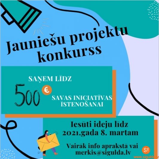 Jauniešu iniciatīvu centrs “Mērķis” aicina ikvienu jaunieti piedalīties “Siguldas novada jauniešu projektu konkursā”, lai īstenotu kādu no savām idejām, kuras aktivitātes vērstas uz Siguldas novada jauniešu attīstību. Projektu konkursa kopējais finansējums ir 2000 eiro, no kuriem viens projekts var saņemt līdzfinansējumu līdz 500 eiro. Šoreiz konkursa prioritāte ir iniciatīvas, kas veicinātu jaunā Siguldas novada jauniešu attīstību, jo pēc Administratīvi teritoriālās reformas Siguldas novadā ietilps arī Krimuldas, Mālpils un Inčukalna novads.