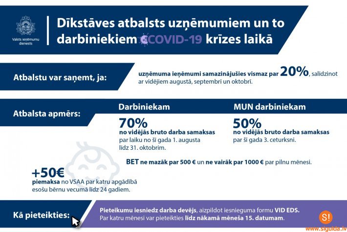 Uzņēmēji, kas ārkārtējās situācijas laikā piedzīvo ieņēmumu kritumu, var vērsties VID un saņemt atbalstu algu subsīdijai saviem darbiniekiem, kas strādā nepilnu darba laiku. Savukārt darba devējam ir pienākums izmaksāt darbiniekam starpību starp saņemtā atbalsta apmēru un darba samaksas apmēru.
