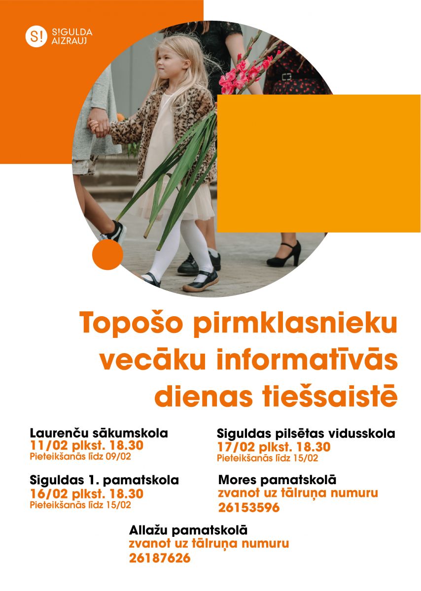 Atgādinām, ka šajā gadā informācijas dienas tiešsaistē topošo pirmklasnieku vecākiem ar Siguldas novada pašvaldības izglītības iestāžu vadību notiks: