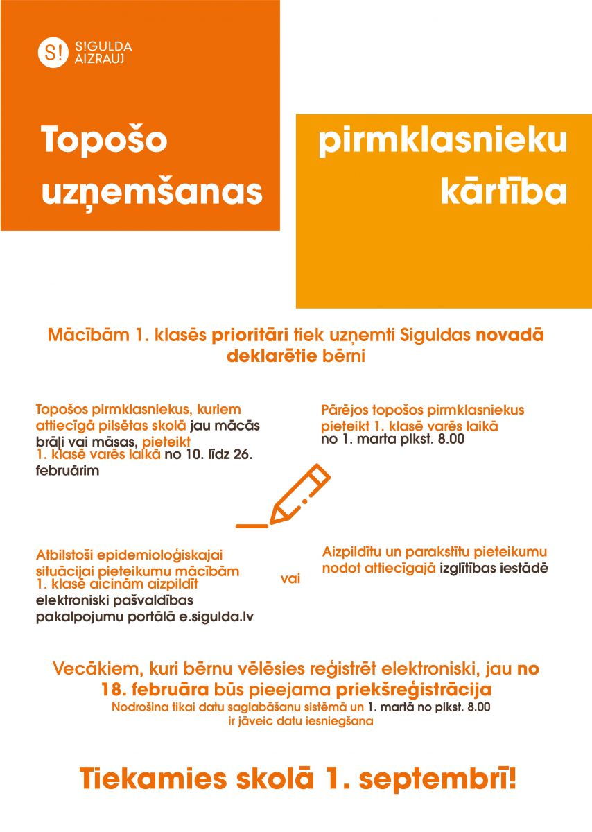 No šodienas, 10. februāra, līdz 26. februārim mācībām 1. klasēs Siguldas novada izglītības iestādēs prioritāri tiek uzņemti topošie pirmklasnieki, kuriem attiecīgajā pilsētas skolā jau mācās brāļi vai māsas. Šo bērnu vecāki atbilstoši epidemioloģiskajai situācijai pieteikumu mācībām 1. klasē aicināti aizpildīt elektroniski pašvaldības pakalpojumu portālā e.sigulda.lv. Tie vecāki, kuriem nav iespēju aizpildīt pieteikumu elektroniski, aicināti aizpildītu un parakstītu pieteikumu ievietot attiecīgās izglītības iestādes pastkastē (pieteikuma veidlapa Laurenču sākumskolai, Siguldas 1. pamatskolai, Siguldas pilsētas vidusskolai).
