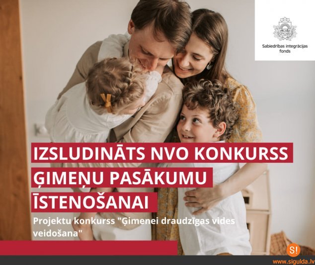 Sabiedrības integrācijas fonds izsludinājis atklātu projektu pieteikumu konkursu nevalstiskajām organizācijām “Ģimenei draudzīgas vides veidošana”, lai īstenotu pasākumus ģimenisku vērtību godināšanai visā Latvijā. Konkursā tiek atbalstītas tādas nevalstiskās organizācijas, kuras reģistrētas vismaz 2 gadus pirms projekta iesniegšanas. Programmā pieejamais finansējums organizācijām no valsts budžeta programmas “Ģimenei draudzīga pašvaldība” šogad ir 170 000 eiro.