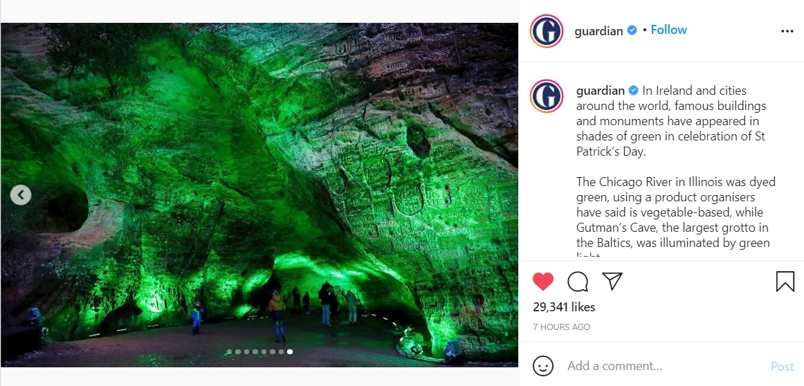 Tradicionāli 17. martā pasaules nozīmīgākās un ikoniskākās kultūras un tūrisma vietas iesaistās starptautiskā projektā “Global greening”, kurā šajā gadā pirmoreiz iesaistījās arī Siguldas novada pašvaldība, zaļā krāsā izgaismojot Baltijā lielāko alu jeb grotu – Gūtmaņalu. Šodien, 18. martā, “The Guardian” sociālo tīklu vietnē “Instagram” apkopojis astoņus labākos objektus, kuru vidū ir arī Sigulda, kas vērtējama kā starptautiska atzinība, ja ņem vērā, ka šajā projektā ik gadu iesaistās vairāk nekā 300 objekti.