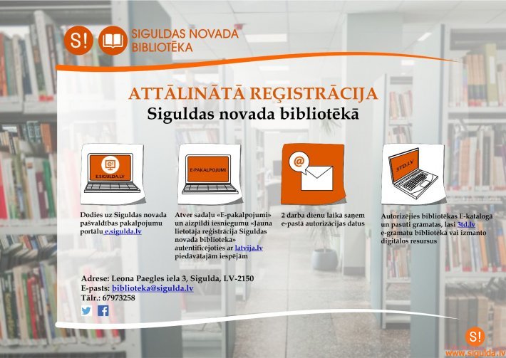 Lai izmantotu bibliotēkas pakalpojumu – saņemtu grāmatas, žurnālus, spēles, DVD diskus un citus dokumentus, jābūt reģistrētam kādā no Siguldas novada bibliotēkām. Laikā, kad valstī noteikta virkne ierobežojumu, iedzīvotājiem iespēja Siguldas novada bibliotēkā reģistrēties un saņemt autorizācijas datus attālināti.