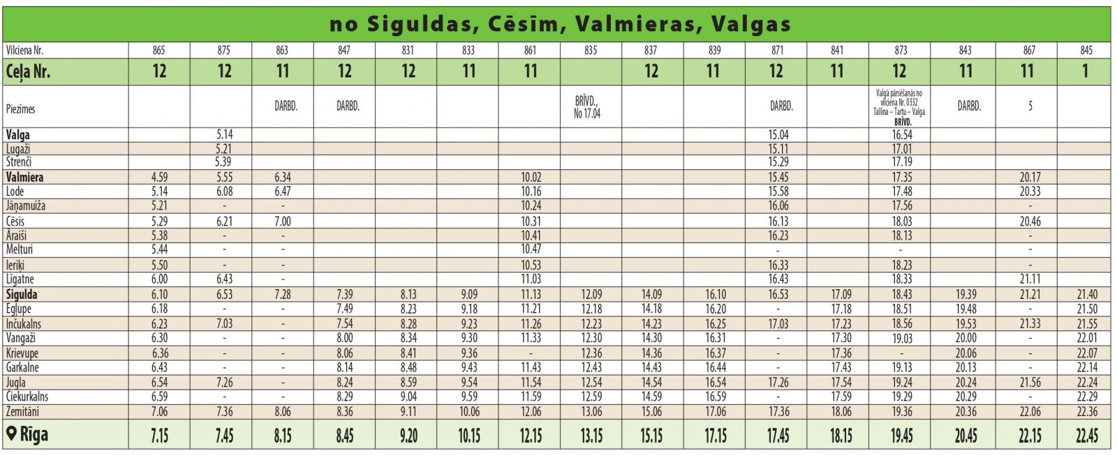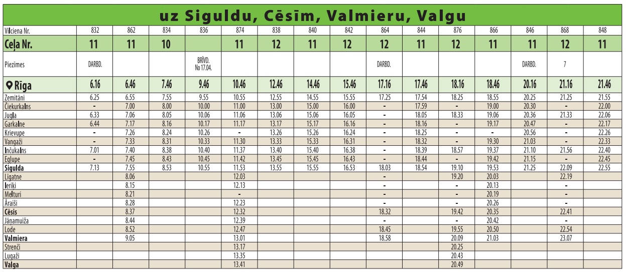 Dīzeļvilcienu atiešanas un pienākšanas laiki Siguldas līnijā, salīdzinot ar iepriekš spēkā esošo grafiku, pārsvarā atšķirsies līdz 16 minūtēm, bet atsevišķiem rīta vilcieniem – līdz pat pusstundai. Lai vilcienu reisi nebūtu jāatceļ, ir mainīta arī ekspresvilciena Valmiera–Rīga Nr. 863 un vilciena Nr. 847 Sigulda–Rīga kursēšanas secība.